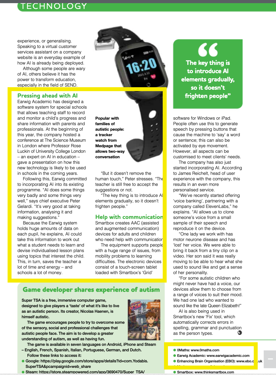 Earwig has drawn the attention of Autism Eye magazine. In the magazine's autumn edition, Earwig was included as part of a feature on Innovation in Special Needs technology, with a particular focus on the forthcoming integration of AI into the Earwig software.